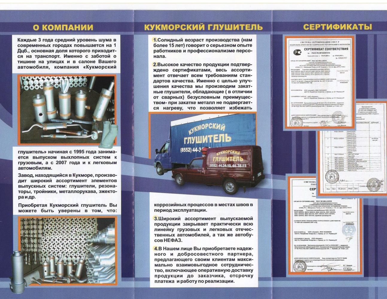 Каждые 3 года средний уровень шума в современных городах повышается на 1 Дцб., основная доля которого приходится на транспорт. Именно с заботой о тишине на улицах и в салоне Вашего автомобиля, компания «Кукморский глушитель» начиная с 1995 года занимается выпуском выхлопных систем к грузовым, а с 2007 года и к легковым автомобилям.Завод, находящийся в Кукморе, производит широкий ассортимент элементов выпускных систем: глушители, резонаторы, тройники, металлорукава, эжектора и др.